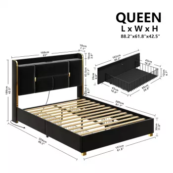 Upholstered Bed Frame with Charging Station and Storage Drawers